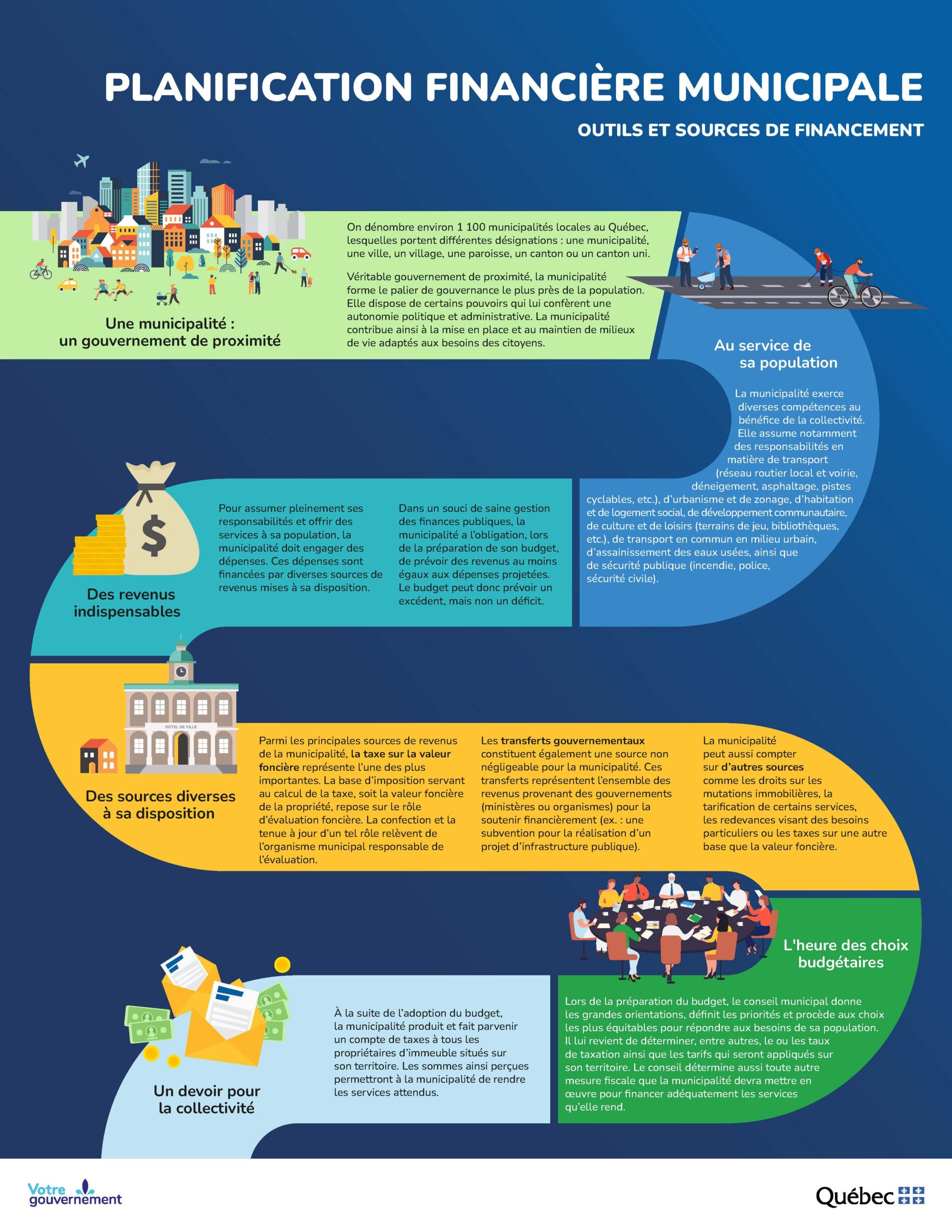 Ce service a la responsabilité de la gestion des finances. Il s’occupe de la taxation et de la perception, du paiement des comptes aux fournisseurs, du service de paie, de la comptabilité municipale, de la communication avec les contribuables.