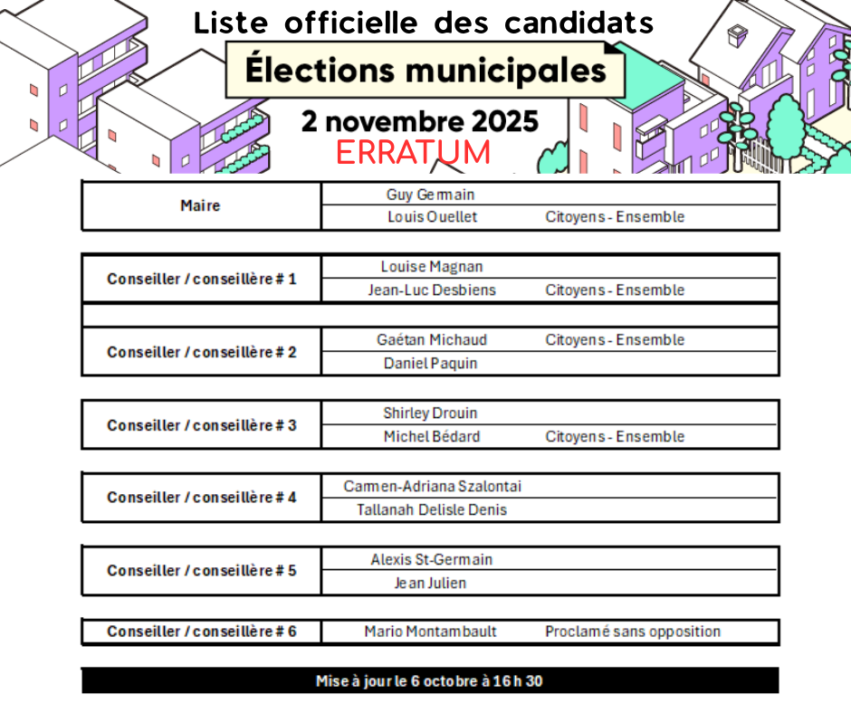 Dans la semaine du 6 octobre 2025, vous recevrez un avis d’inscription à l’élection municipale du 2 novembre prochain et il est de votre devoir de vous assurer que l’ensemble des électeurs éligibles au vote soit inscrit. Si vous notez des erreurs sur cet avis, nous vous invitons à vous présenter à la commission de révision qui aura lieu le 16 octobre 2025 de 10 h à 16 h et le 20 octobre 2025 de 17 h à 20 h.